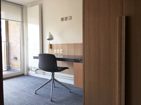 The interior gives a nod to the mid-century, and has been carefully designed to accommodate all the amenities of a 3 - 4 * hotel. It includes floating desks and custom designed wall-to-wall joinery in natural oak, grey mirror and grey marble. Buttoned brown leather headboards look sleek and add comfort along with Scandinavian furniture and lighting and bespoke textiles by British designer Eleanor Pritchard. The neutral palette of browns and greys are punctuated with pops of bright colours. Eve worked closely with the College archivist to select historic, and also whimsical black and white photographs from the archive to have enlarged and framed.